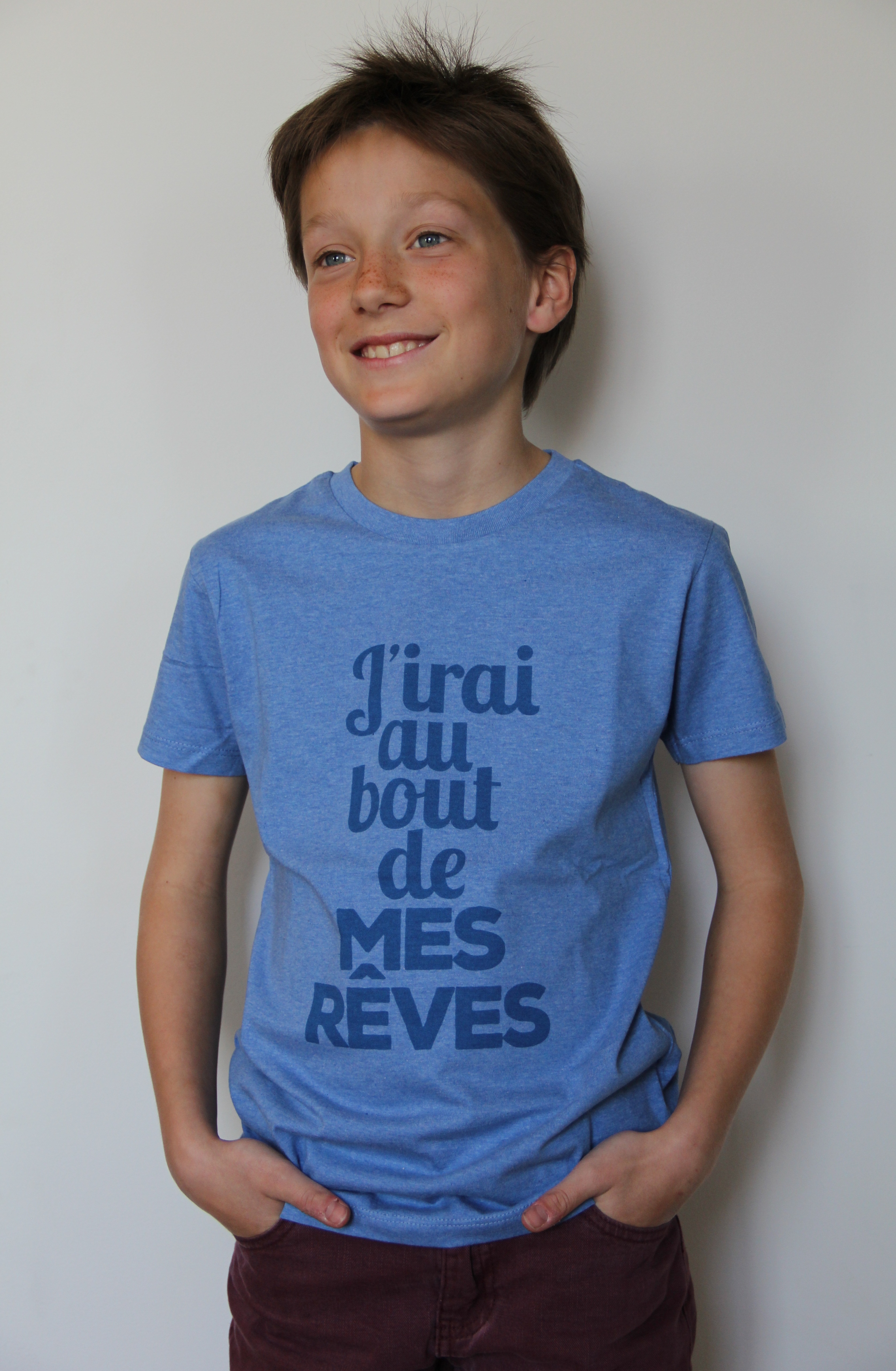 Parce que l’enfance est pleine de promesses. Yes, they can. Bleu chiné, coton bio.