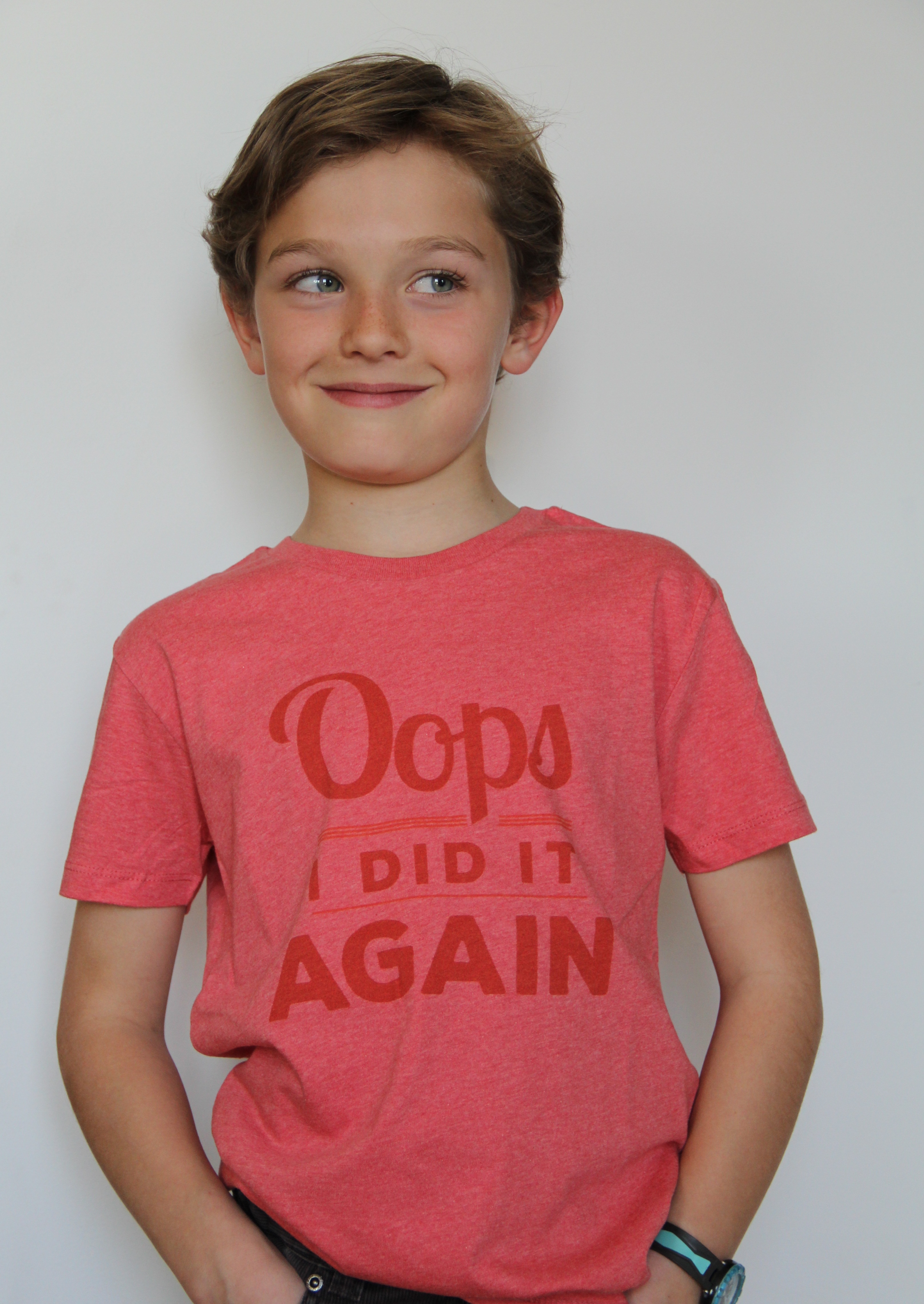 Parce que de temps en temps on a le droit de rire de ses bêtises, non? Rouge corail chiné, coton bio.