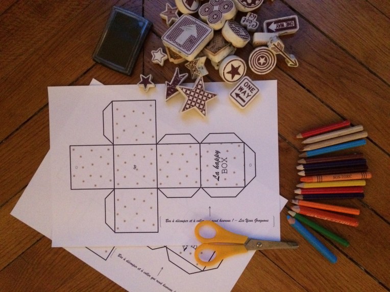 Le tuto vient de « Les Yeux Grognons », je vous le mets ici car vous aurez besoin d’imprimer la forme de la boite (sur une feuille A4 en noir et blanc ce sera nickel): http://ouiaremakers.com/diy-la-happy-box/