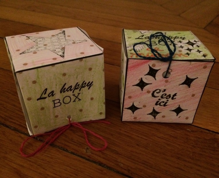 Alors voilà l’idée : fabriquer une « happy box »! Avec une feuille de papier, une paire de ciseaux, crayons de couleurs, colle, stickers ou tampons, et quelques neurones 🙂