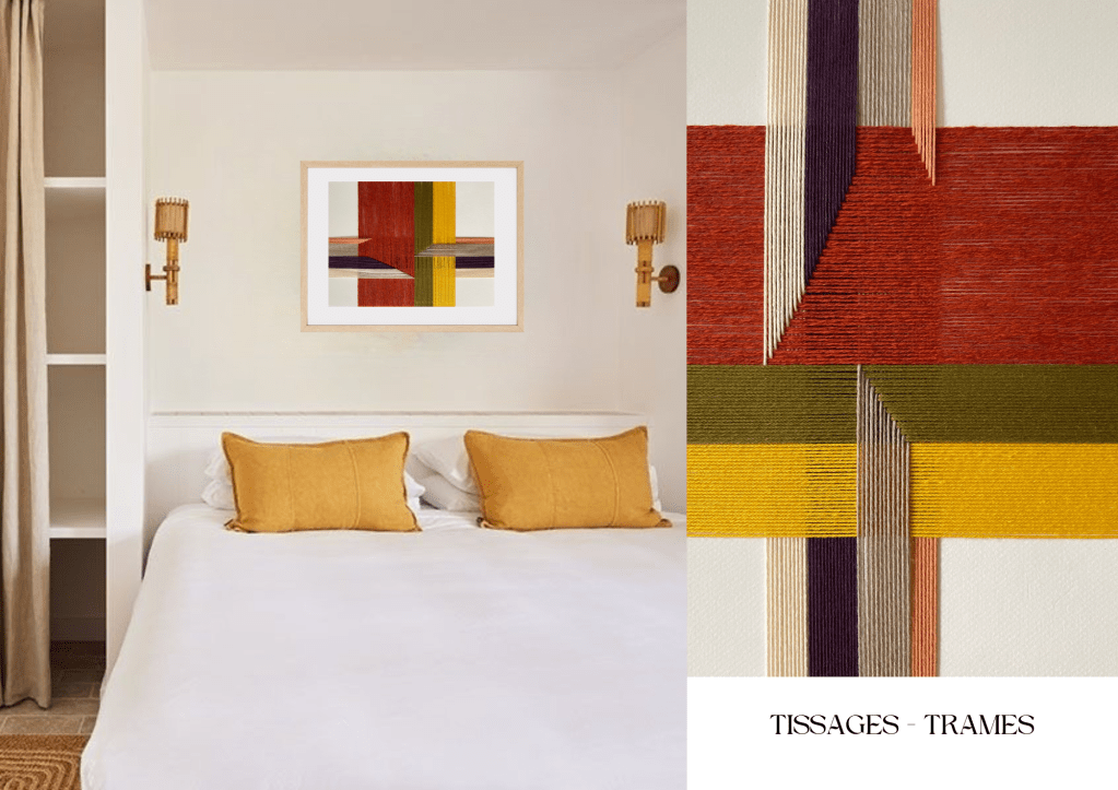 - TRAMES : les fils se mêlent en chaines et trames pour un rendu ultra graphique. Son point de départ est la gamme de couleurs, qui s’adapte selon vos goûts personnels.