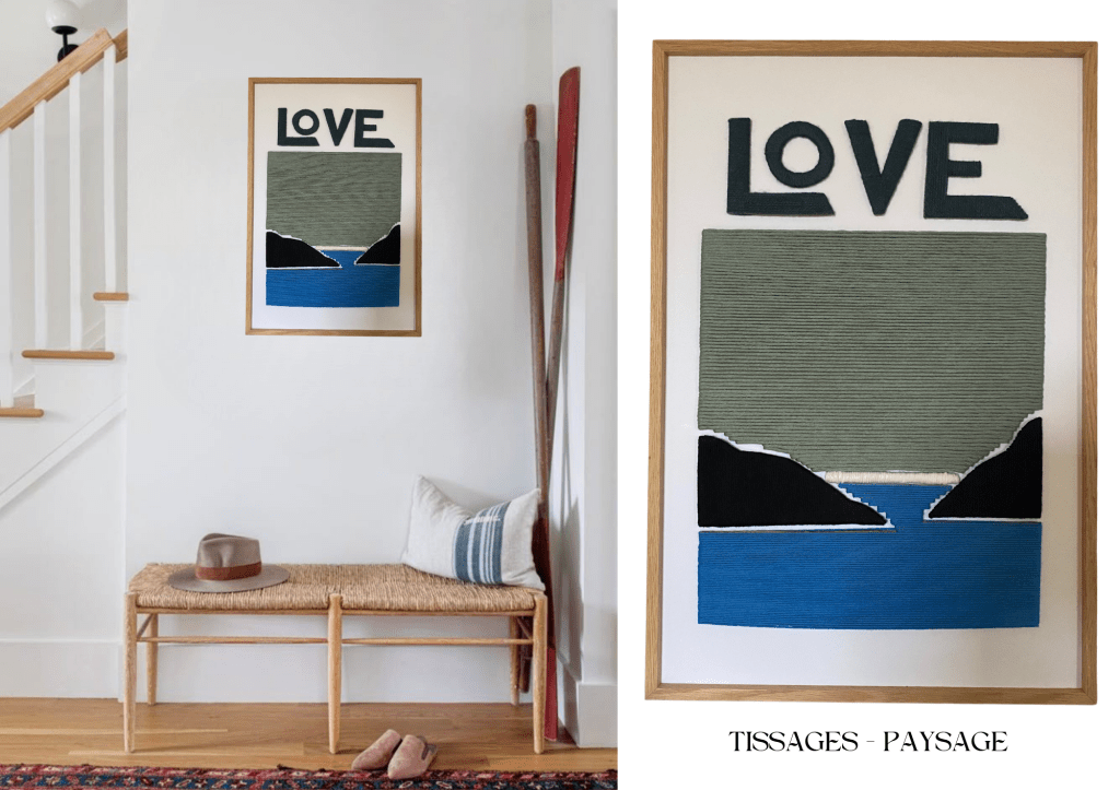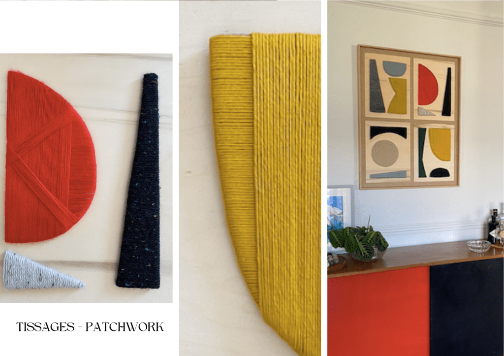Les tableaux que je vous propose dans cette collection sont des compositions graphiques sur cartons et bois, qui sont ensuite tissées à la main selon leurs formes.