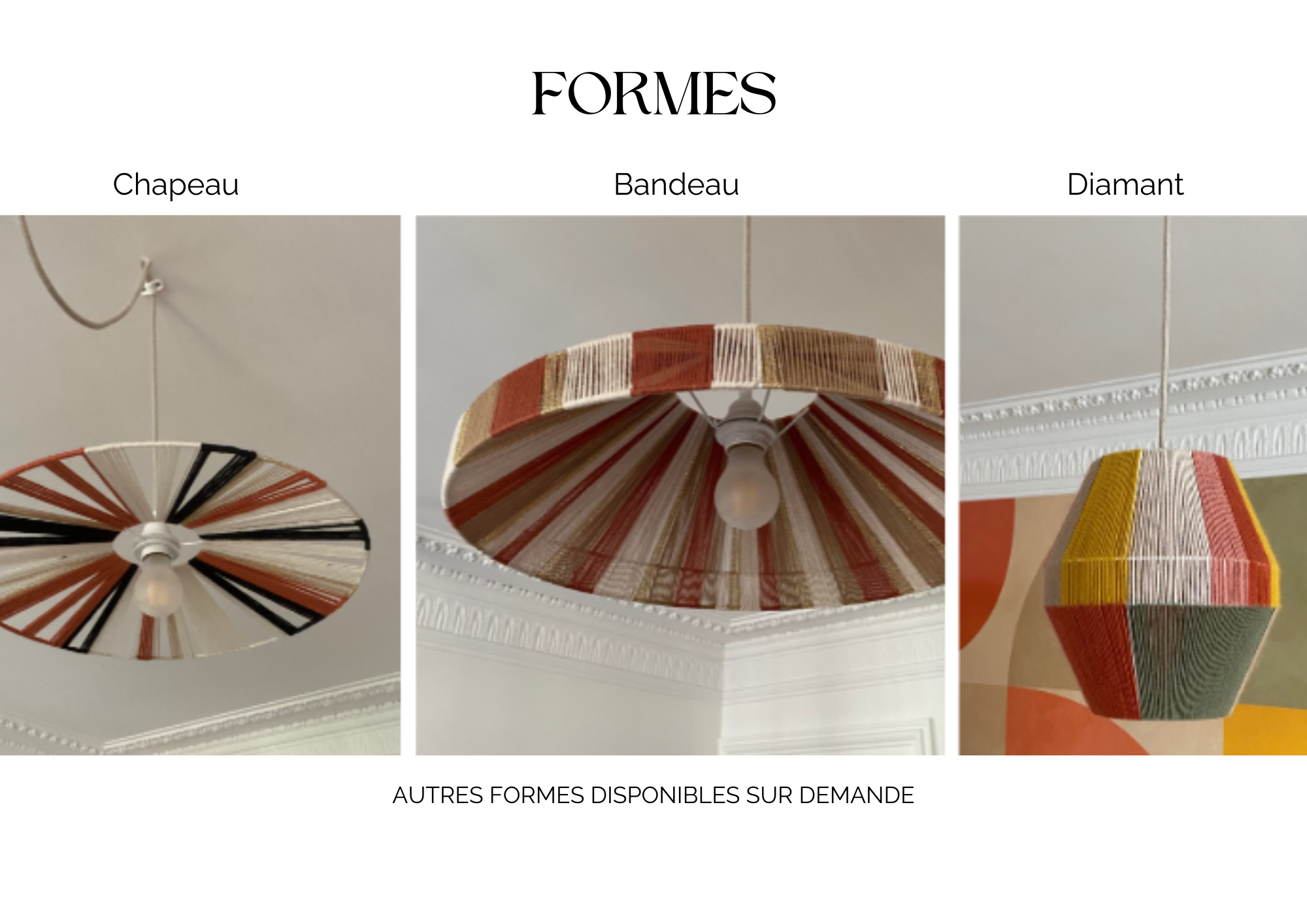 Les abat-jours sont tissés à la main selon des techniques de tissage et de nouage originales, qui donnent vie à des objets ayant une belle personnalité, grâce à leurs jeux de couleurs et à leurs matières naturelles. Chaque abat-jour est une pièce unique, dont la forme, le mix couleur et la couverture (plus ou moins dense) sont définis avec vous.