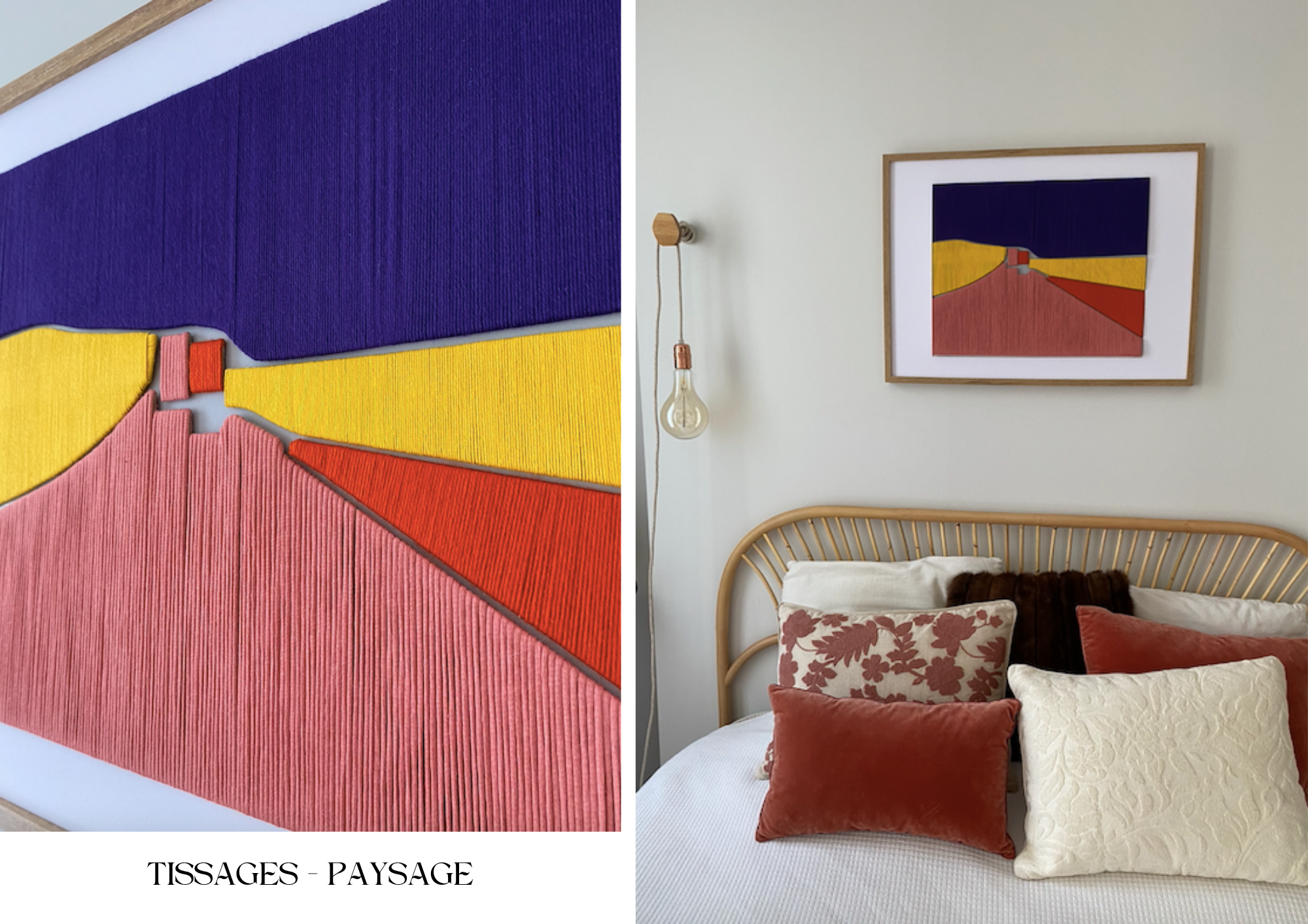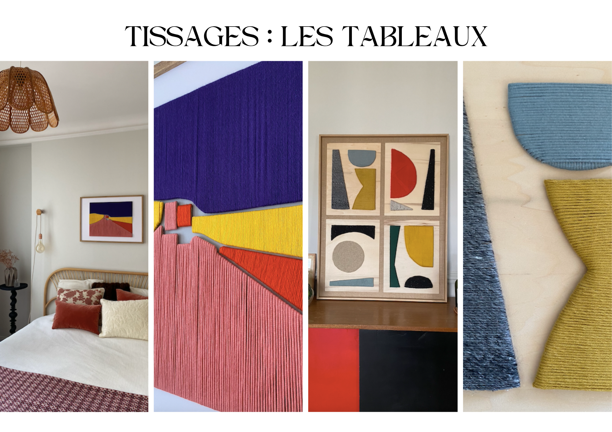 Les tableaux que je vous propose dans cette collection sont des compositions graphiques sur cartons et bois, qui sont ensuite tissées à la main selon leurs formes.