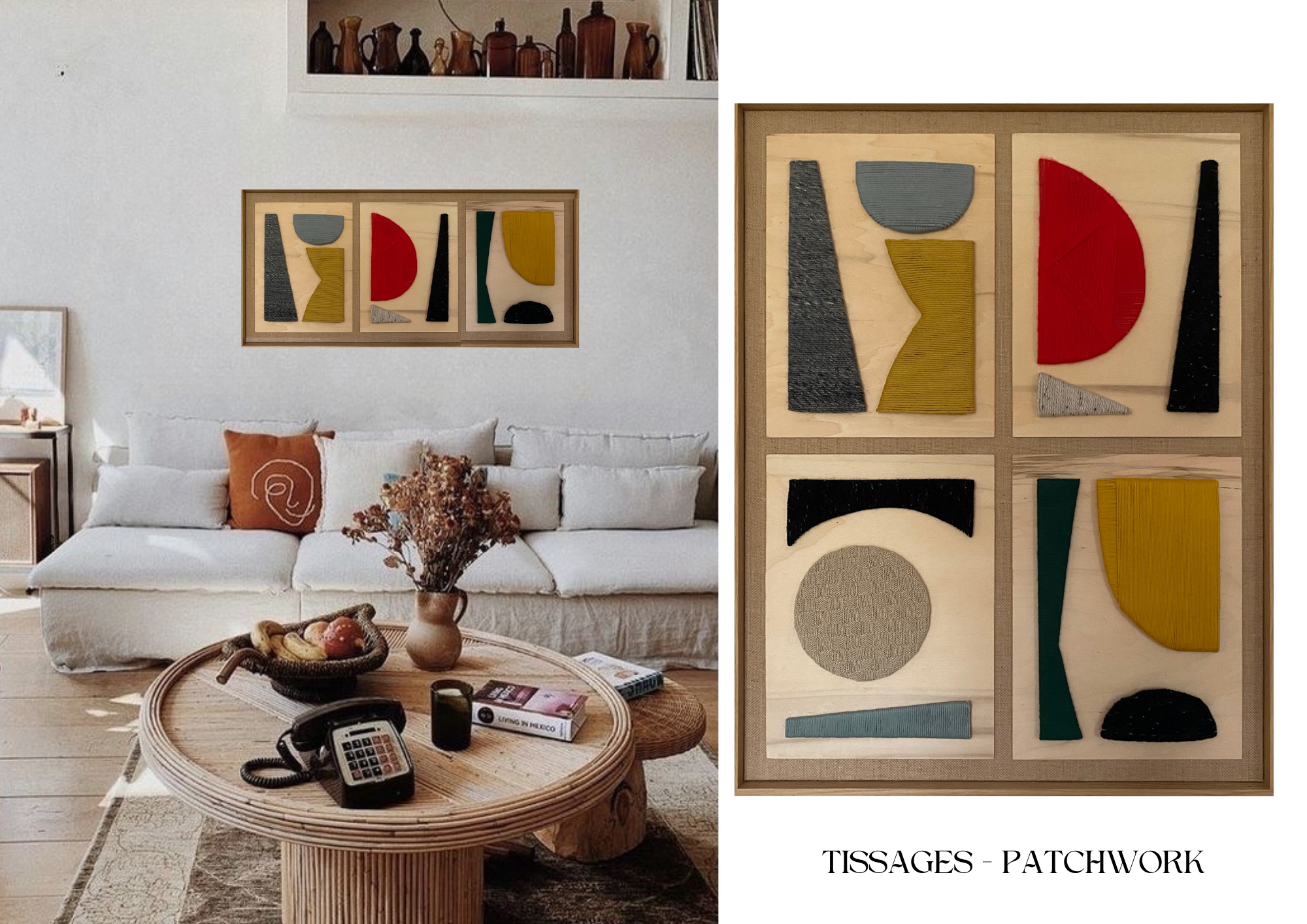 - PATCHWORK : les formes géométriques et/ou primitives se mixent pour un rendu brut. Son point de départ est une association de formes et de couleurs.